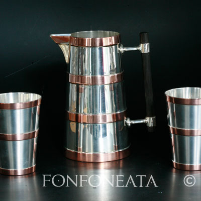 Christopher Dresser jug with beakers, stamped H & H 2457 - copper and silver plate, Ca. 1880