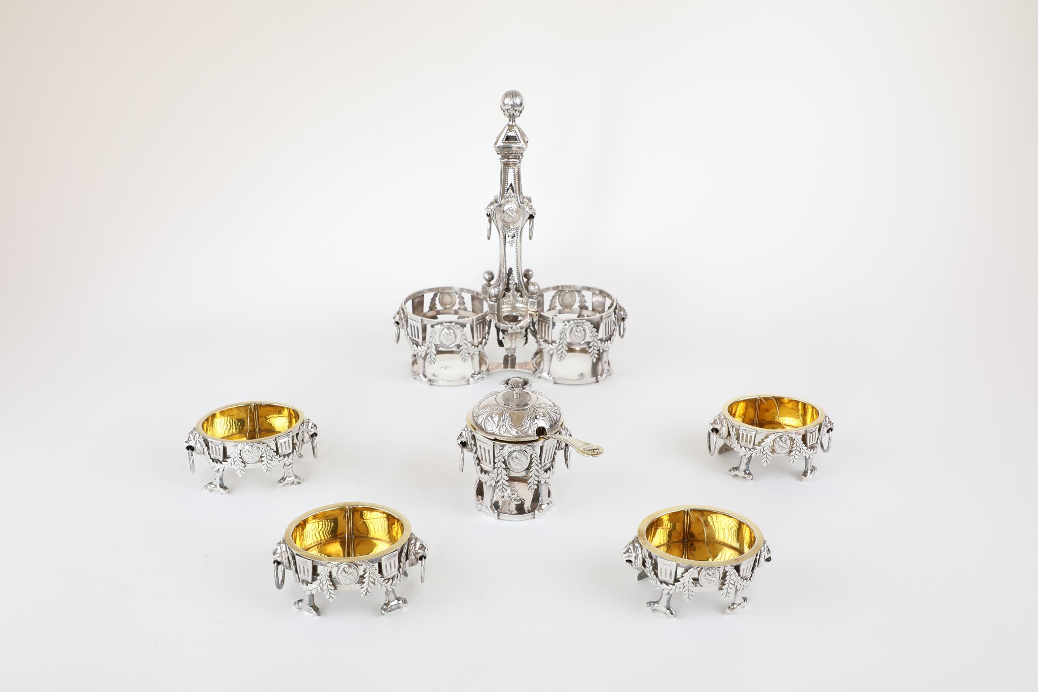 Zeldzame set van een olie en azijn, mosterdpotje en 4 zoutvaatjes in massief zilver. Brussel 1785