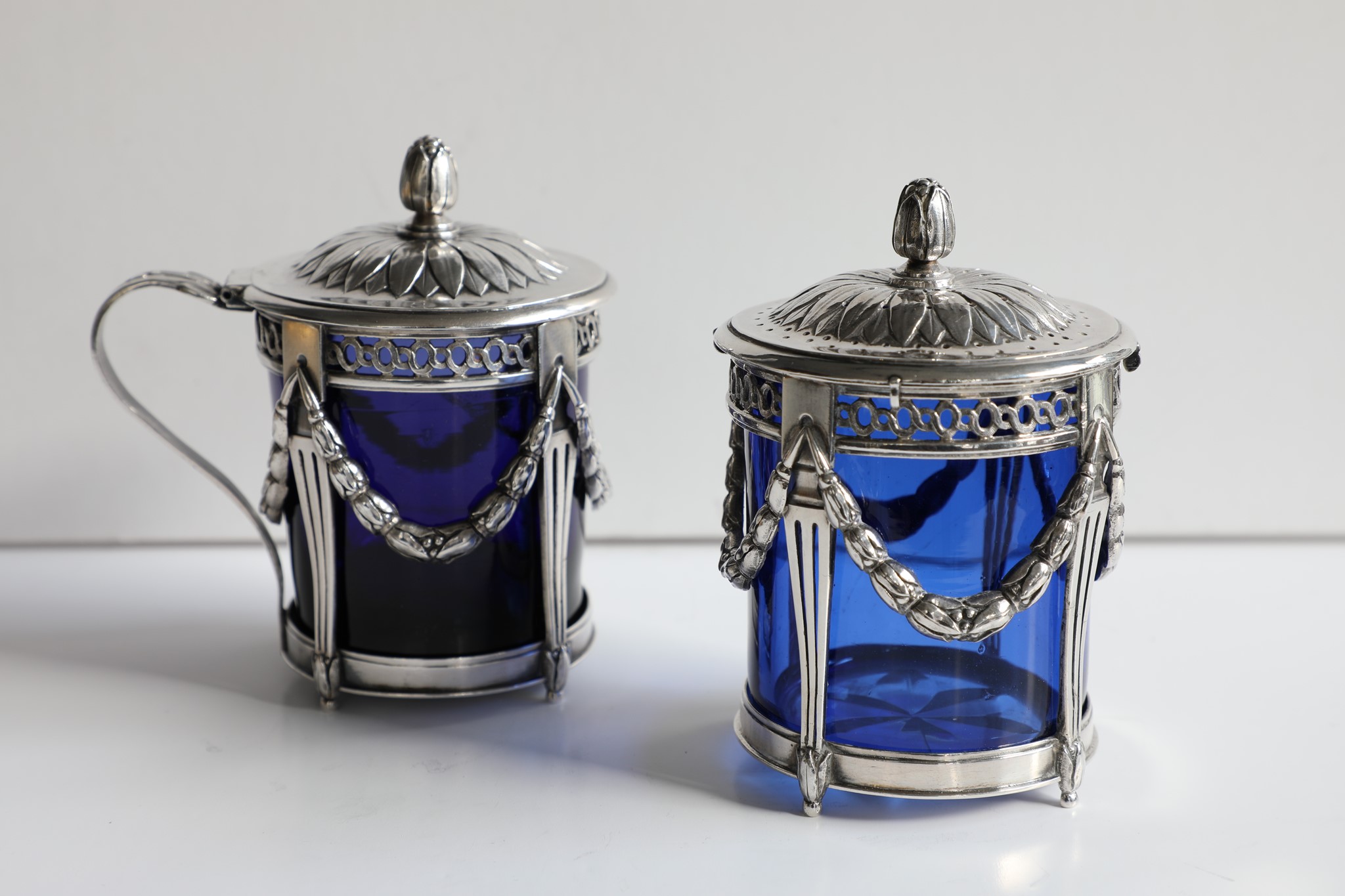 Silver sugar caster and mustard pot, with cobalt blue glass, workshop Jan Baptiste Verberckt, Antwerp, 18th C.