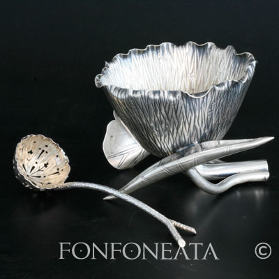 Suikerkom in japanse stijl, design door Christopher Dresser gemaakt door Heath & Middleton, London 1886 - 1887
