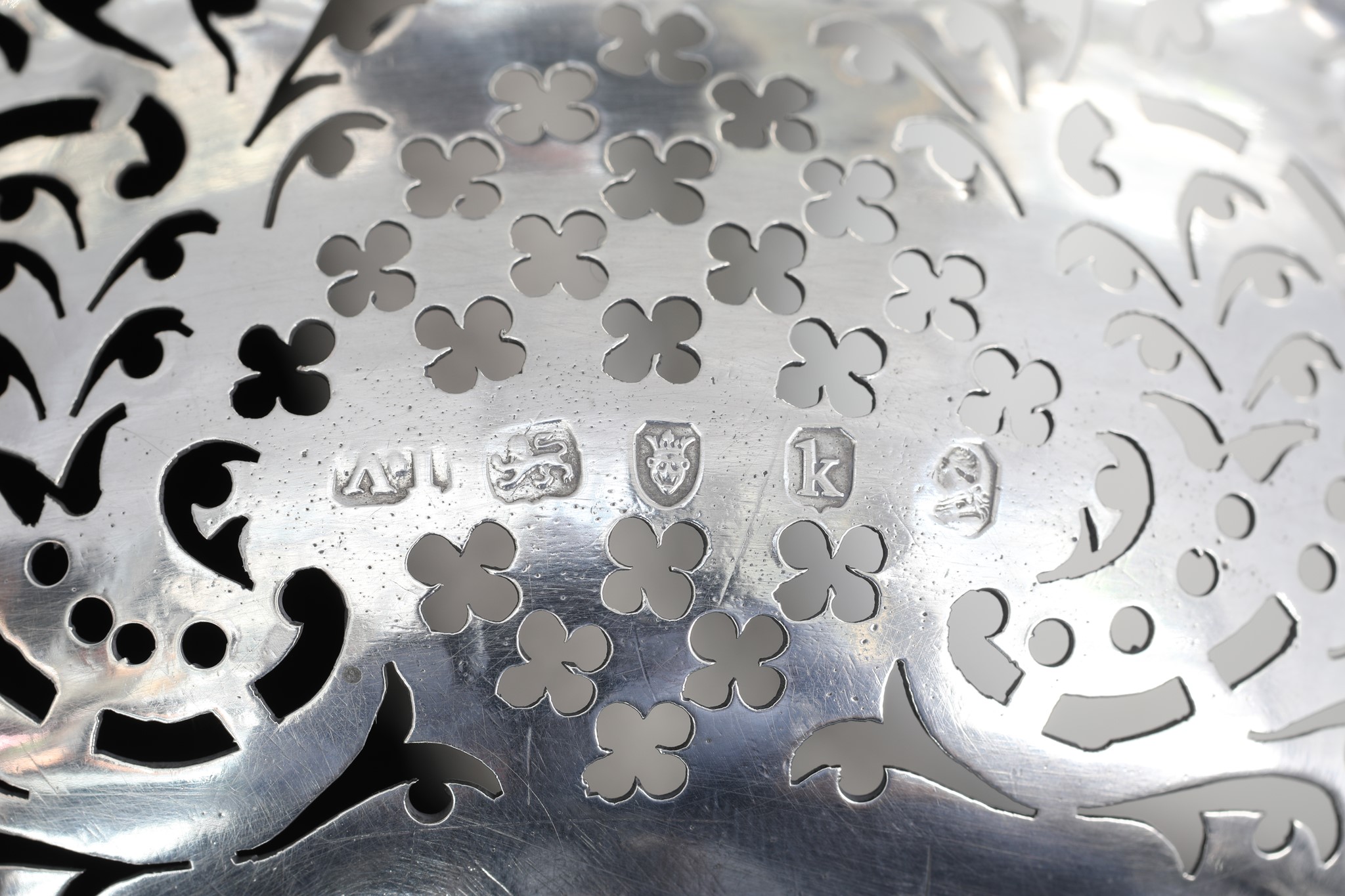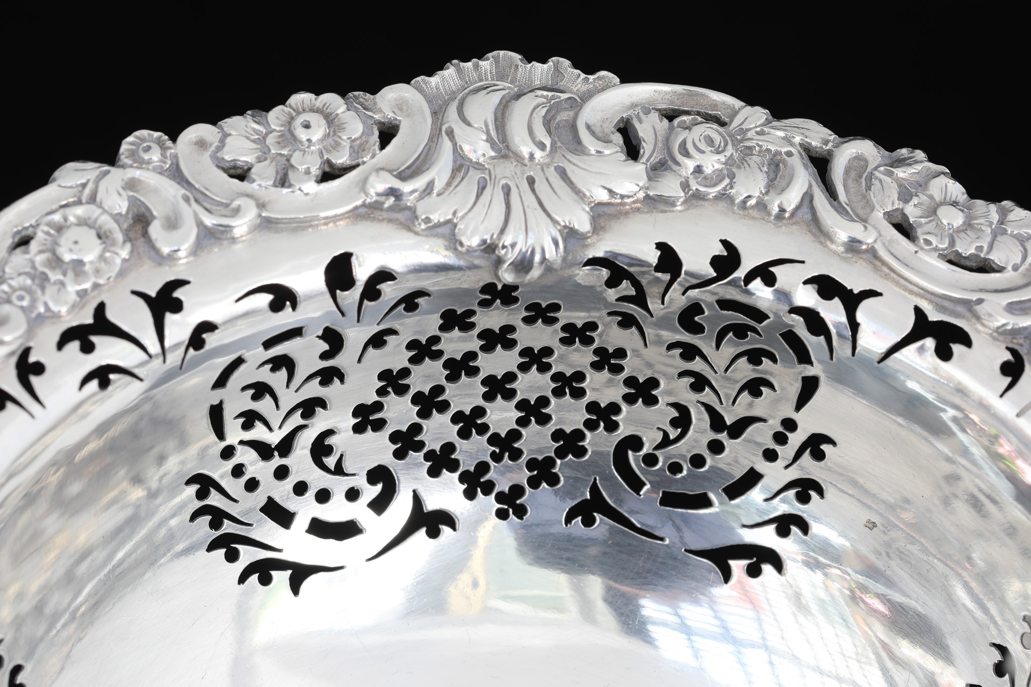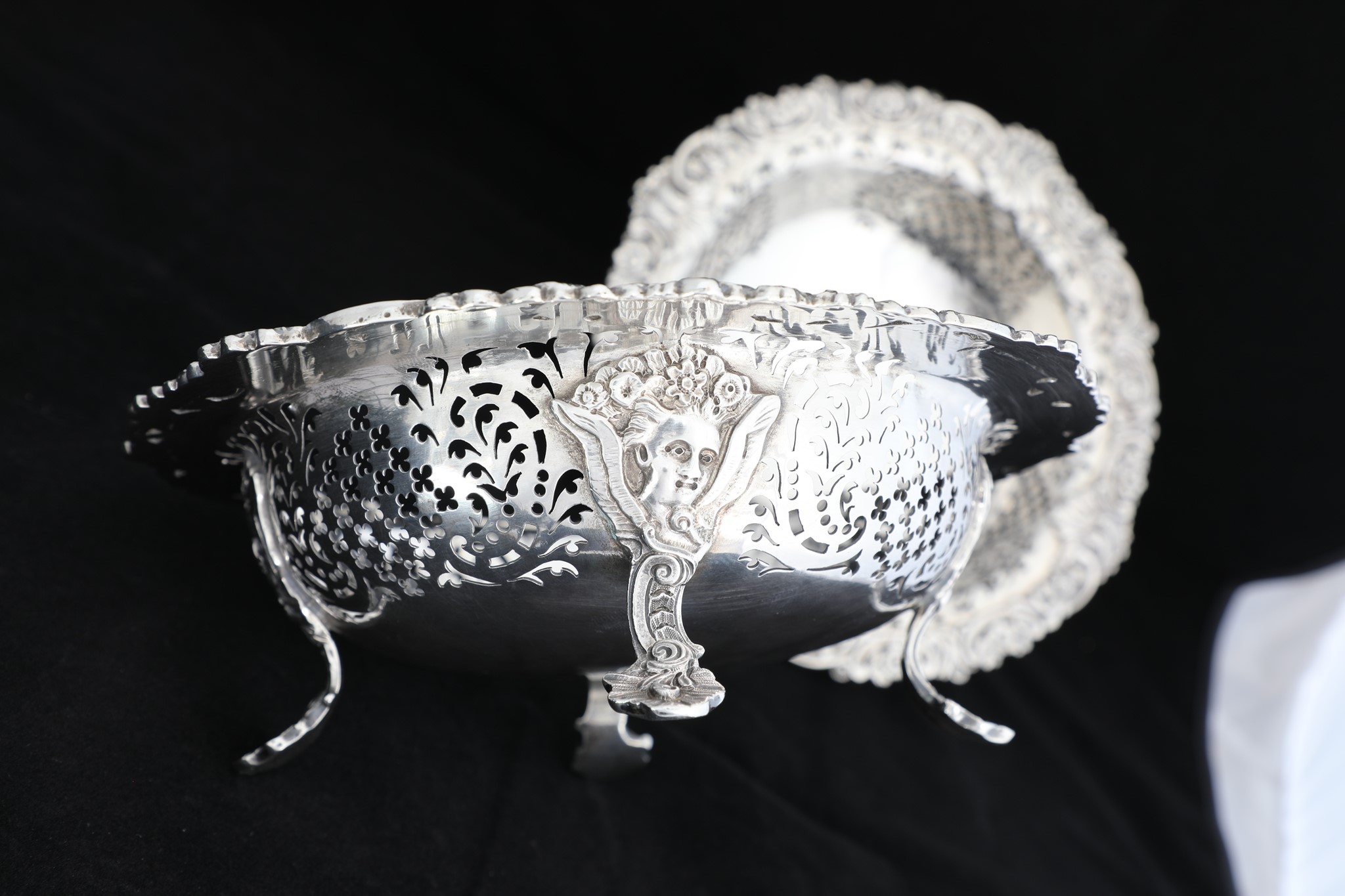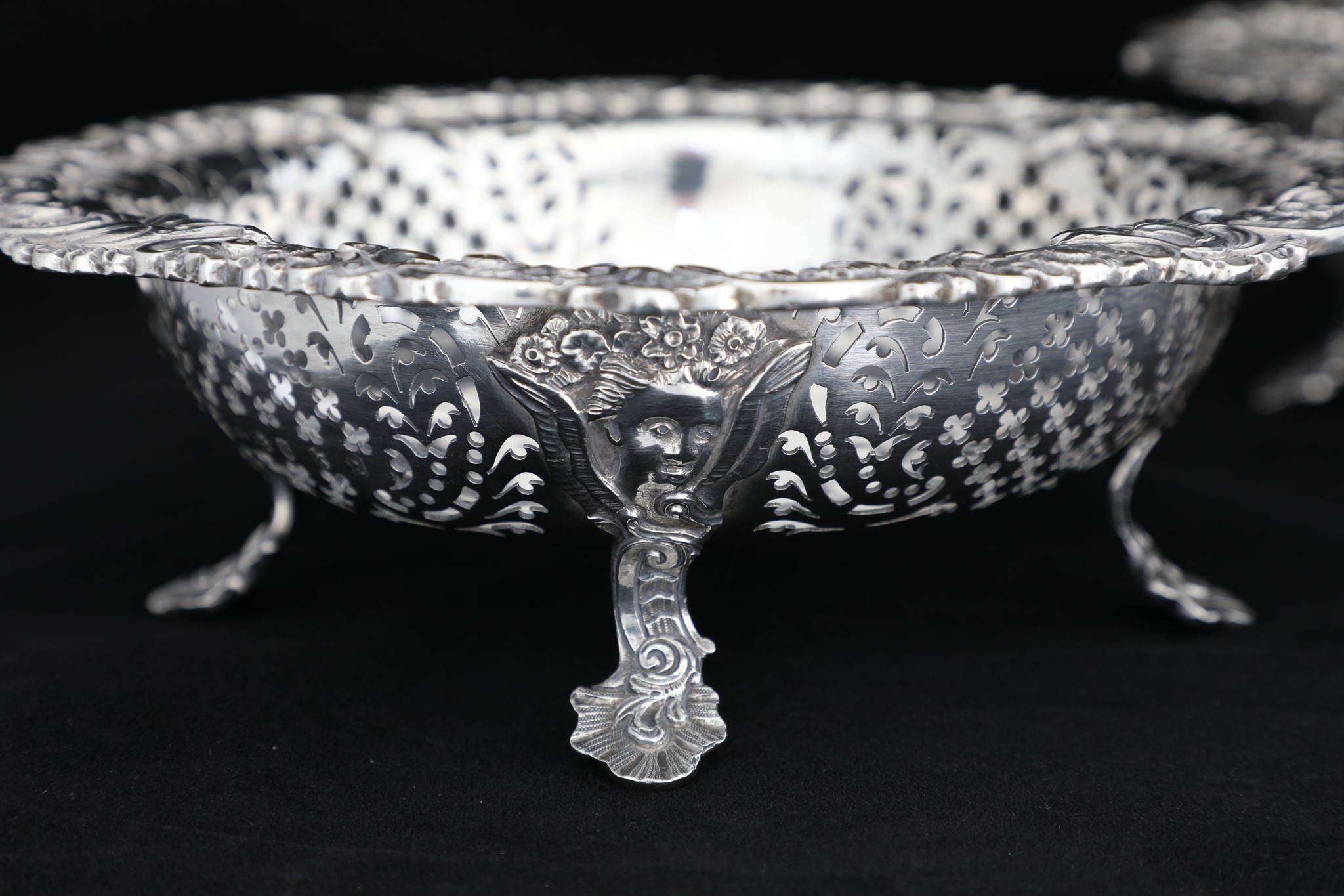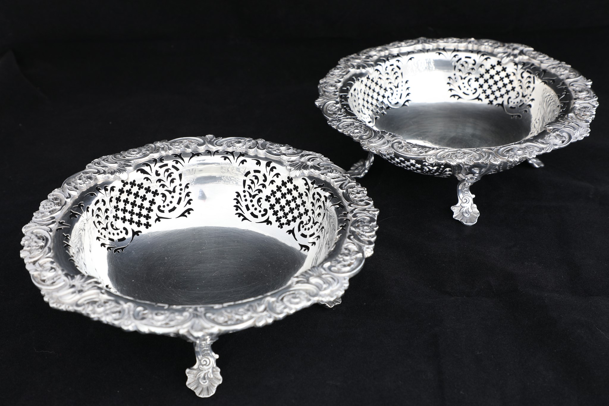 A pair of silver baskets, shaped round, standing on cast foot, and feature pierced sides, and ornate borders.